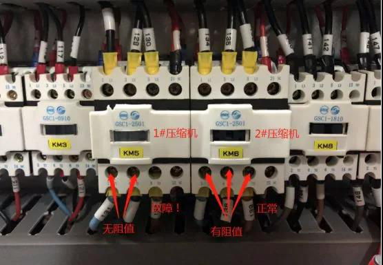 使用萬用表測量1#壓縮機接觸器及2#壓縮機接觸器下端電阻值,檢查壓縮機三相繞組是否正常。經過維護人員檢查,發現1#壓縮機A、B點之間阻值無窮大(壓縮電機是三相電機,內部有三個對稱繞組,分別是U、V、W(兩個端子一組),通過三相電能產生旋轉磁場,三相電機繞組對稱,測量電阻值都是相等的。三相壓縮機的功率較大,繞組值較小,一般都在5Ω左右)2#壓縮機各相之間的電阻值均顯示正常;由此判斷1#壓縮機損壞,需要更換壓縮機。