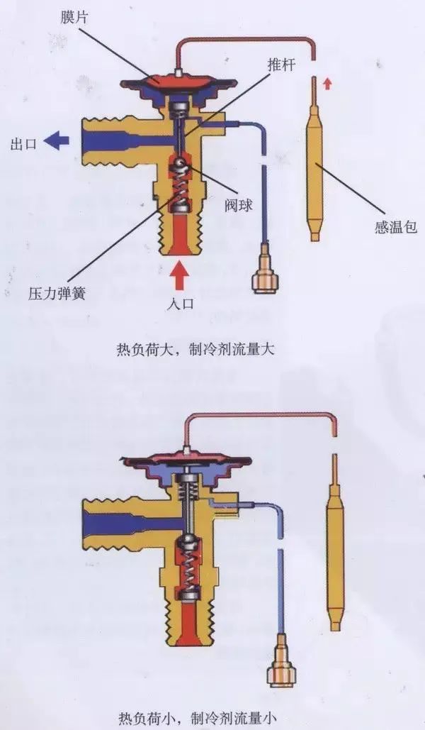 工作時(shí),固定在蒸發(fā)器出口管道上的感溫包感應(yīng)蒸發(fā)器出口的過(guò)熱溫度,使感溫包內(nèi)產(chǎn)生壓力,并由毛細(xì)管傳到膜片上部的空間,在壓力的作用下膜片以彈性變形的方式把信號(hào)傳遞給頂針(執(zhí)行機(jī)構(gòu)),從而調(diào)節(jié)閥們的開(kāi)度,控制制冷劑的流量。