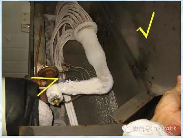 另外當(dāng)系統(tǒng)中出現(xiàn)膨脹閥供液時(shí)多時(shí)少或膨脹閥關(guān)不小,過(guò)熱度,過(guò)冷度不正確等現(xiàn)象時(shí),原因可能就是感溫包出了故障。感溫包故障包括毛細(xì)管斷裂,使感溫包內(nèi)的充注物漏掉,導(dǎo)致不能把正確的信號(hào)傳給熱力膨脹閥的執(zhí)機(jī)構(gòu),以及感溫包包扎位置不正確。