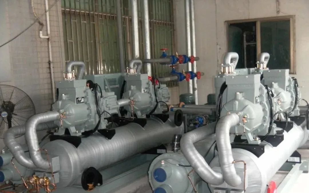 離心機:最早出現在上個世紀二十年代,它是依靠離心式壓縮機中高速旋轉的葉輪產生的離心力來提高制冷劑蒸汽壓力,以獲得對蒸汽的壓縮過程,然后經冷凝節流降壓,蒸發等過程來實現制冷,其組成部件主要有離心式壓縮機、蒸發器、冷凝器、節流機構、抽氣回收裝置、潤滑系統和電氣控制冷凝器、節流機構、抽氣回收裝置、潤滑系統和電氣控制柜等。它具有單機制冷量大的特點,但存在壓力過高密封問題較難解決、工作轉速過高等缺點。