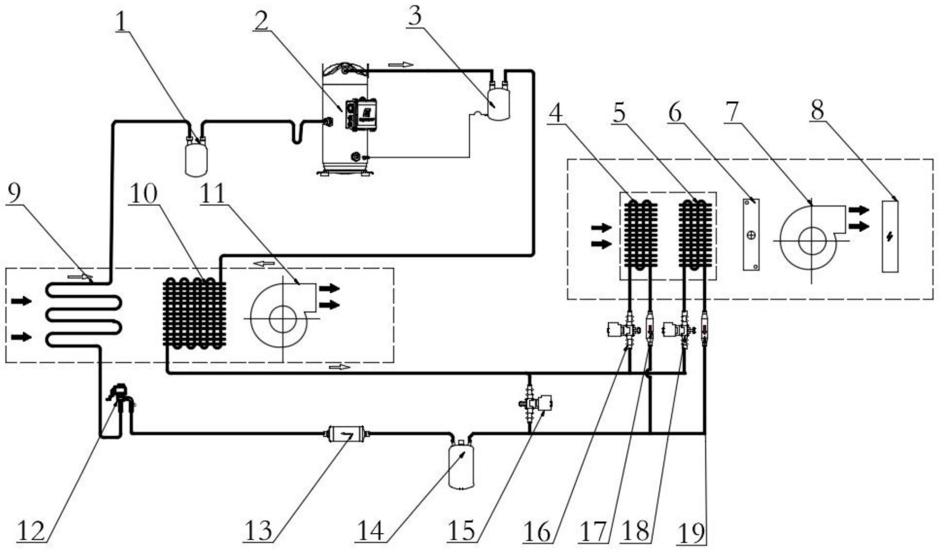 一種節(jié)能型高溫烘干除濕機(jī),申請(qǐng)?zhí)柣驅(qū)@?hào):202410975186.6,本發(fā)明涉及除濕機(jī)技術(shù)領(lǐng)域,尤其涉及一種節(jié)能型高溫烘干除濕機(jī)。其技術(shù)方案包括:高溫烘干房和固定安裝于高溫烘干房一側(cè)的除濕房,還包括:設(shè)于除濕房?jī)?nèi)的第一風(fēng)道和第二風(fēng)道,制冷循環(huán)系統(tǒng),所述制冷循環(huán)系統(tǒng)安裝于第一風(fēng)道和第二風(fēng)道內(nèi),冷凝器控制系統(tǒng),所述冷凝器控制系統(tǒng)安裝于第一風(fēng)道和第二風(fēng)道內(nèi)。本發(fā)明可以完全利用第一冷凝器和第二冷凝器以及第三冷凝器內(nèi)的熱量,并且不需要經(jīng)過(guò)排濕過(guò)程損失大量熱量同時(shí)也降低了效率,節(jié)能高效;通過(guò)控制第二冷凝器和第三冷凝器的啟閉狀態(tài),能夠?qū)崿F(xiàn)多級(jí)變化不僅可以適應(yīng)寬范圍烘干溫度,而且在各溫度下均能穩(wěn)定安全運(yùn)行。