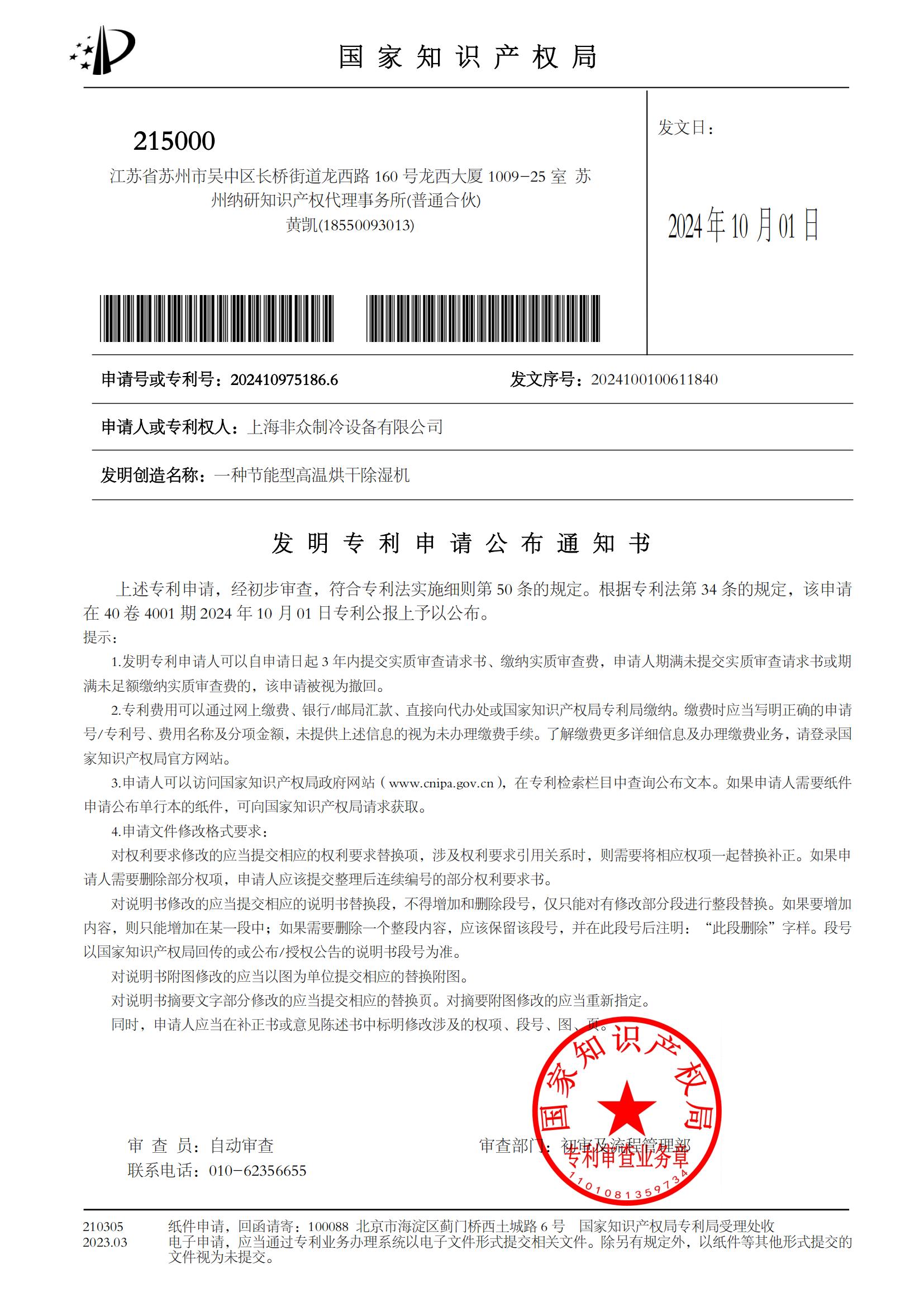 熱烈祝賀上海非眾制冷“一體式的屋頂空調(diào)機(jī),專利號(hào):ZL 2024 2 0258431.7”實(shí)用新型專利獲得國(guó)家知識(shí)產(chǎn)權(quán)局授權(quán),取得專利證書(shū)并申請(qǐng)公布發(fā)明專利“ 一種節(jié)能型高溫烘干除濕機(jī),申請(qǐng)?zhí)柣驅(qū)@?hào):202410975186.6 ”