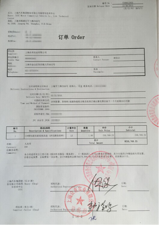 上海汽車(chē)集團(tuán)股份有限公司商用車(chē)技術(shù)中心向上海眾有實(shí)業(yè)有限公司下采購(gòu)訂單