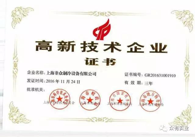 獲得高新技術企業認證,證明了非眾制冷在本領域中具有較強的技術創新能力、高端技術開發能力。