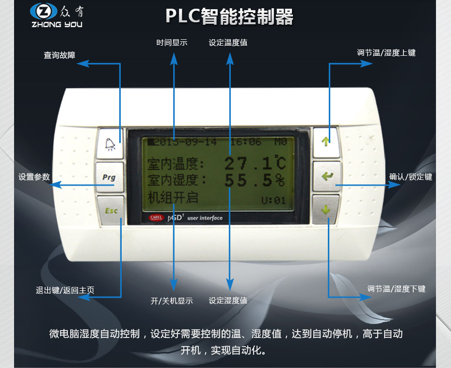 3、高性能電子電極加濕器:不滋生細(xì)菌,對室內(nèi)空氣無污染;對水質(zhì)無特殊要求,無需水處理;獨立加濕器控制板,自動定時換水清洗,延長使用壽命,能自動根據(jù)加濕要求控制水位及加濕電極電流,實現(xiàn)高精度控制,真正滿足高精度要求;