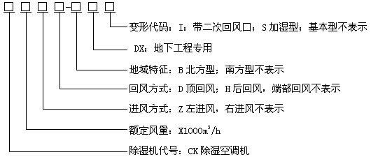 型號示例: CK12-DX 表示名義風量為12000m3/h,回風方式為端部回風的南方型地下工程用除濕空調機,面對機組控制器,回風口在右側。